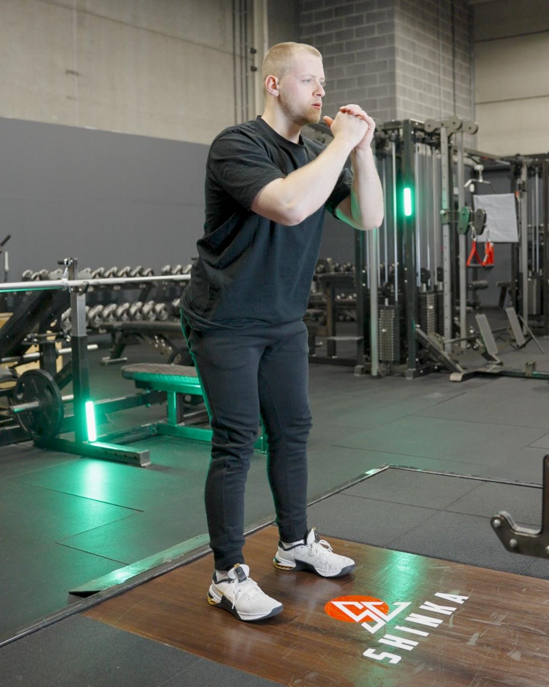 Zodra het vertrouwen met de box er is, schakel je over naar een squat zonder ondersteuning. Door de box weg te nemen vergroot je de bewegingsvrijheid, wat meteen de mobiliteit van je klant test. Als je merkt dat hij of zij de techniek niet kan behouden bij een diepere squat (rechte rug, voeten stabiel, knieën die mooi uitlijnen,...), forceer dan niet te snel. Vergroot de amplitude geleidelijk over meerdere weken.