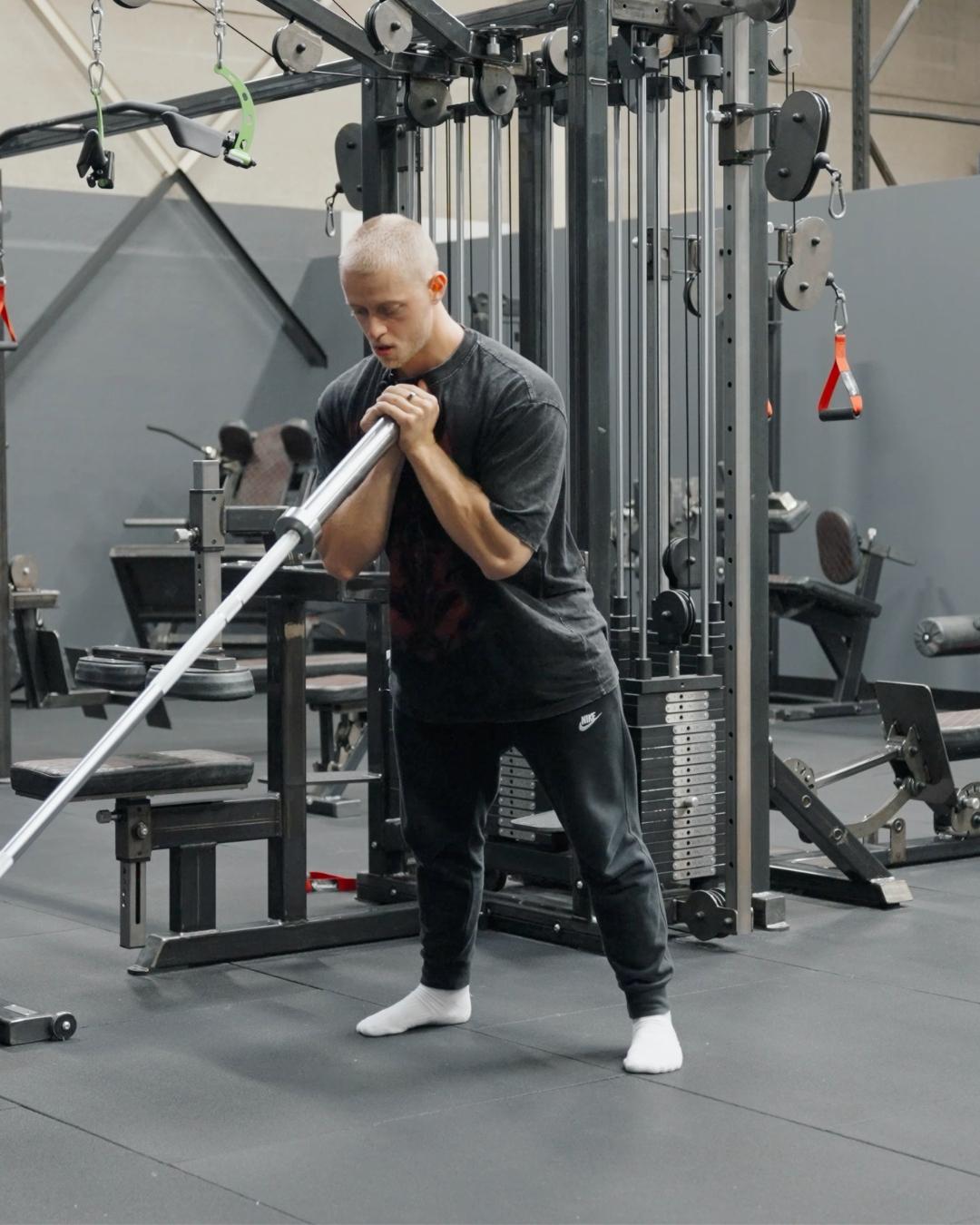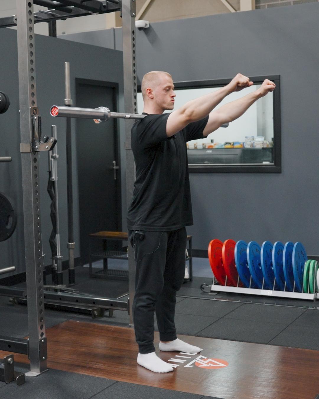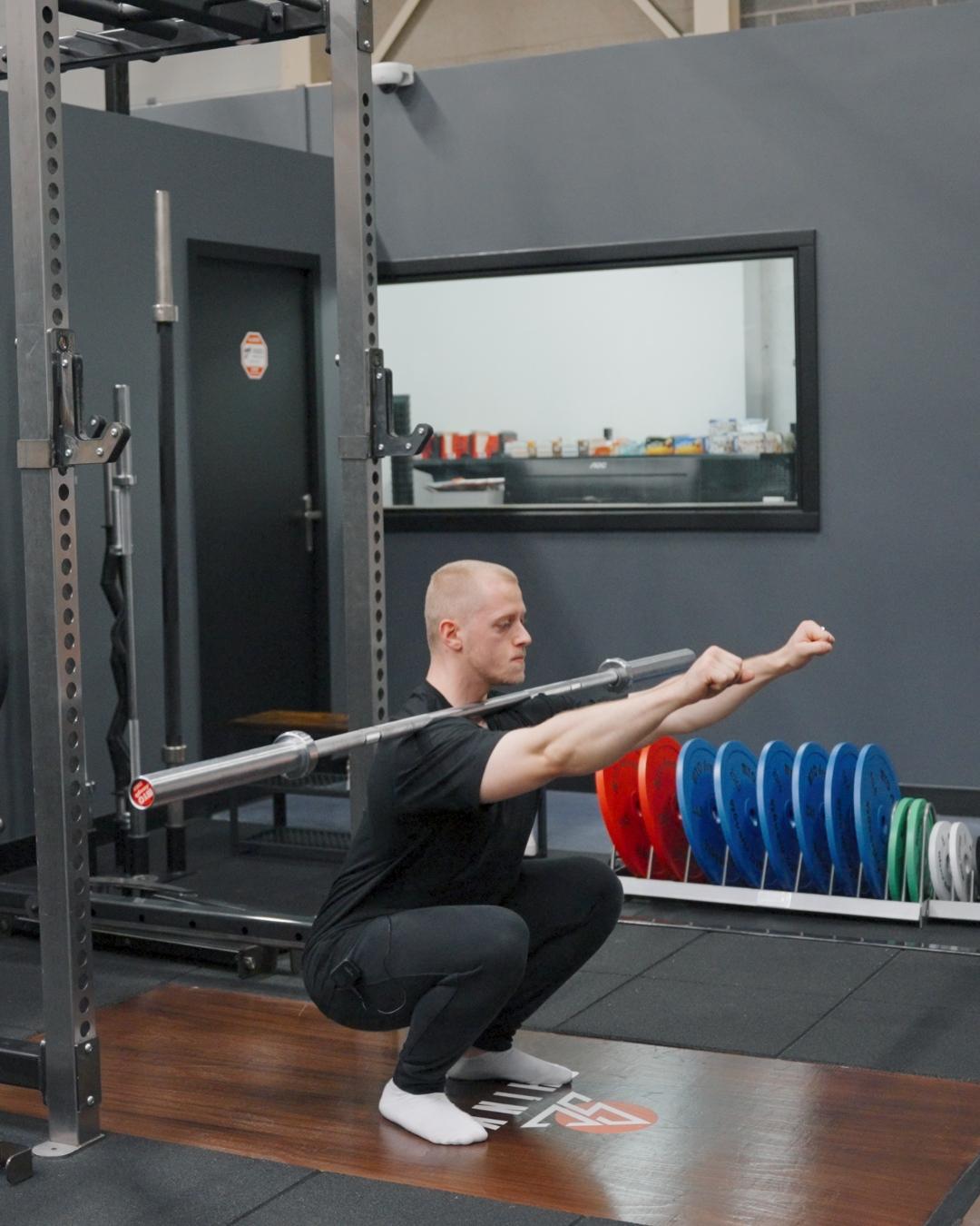 Bovendien helpt deze variant om het bovenlichaam te versterken — iets wat cruciaal is voor een goede back squat, want de belasting rust uiteindelijk op de trapezius en de bovenrug. Je bovenlichaam moet deze dus kunnen dragen.