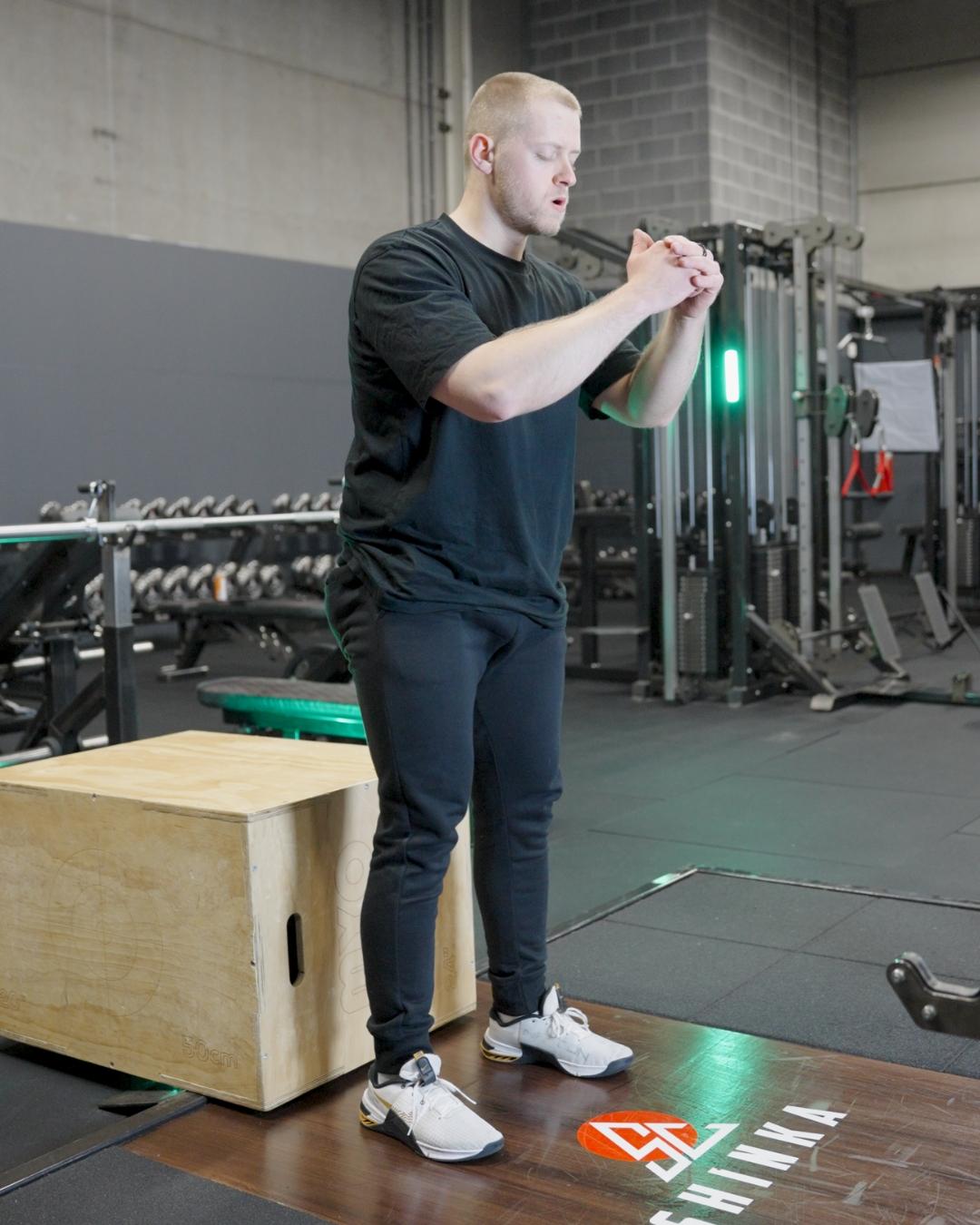Ideaal voor klanten die weinig kracht of zelfvertrouwen hebben. De box dient als referentie voor de diepte en zorgt voor een gevoel van veiligheid. Deze oefening vertraagt het tempo en laat toe om de excentrische fase te controleren. Voor veel mensen zal deze variant echter te gemakkelijk zijn — in dat geval kan je meteen overstappen naar stap 2 of zelfs stap 3.
