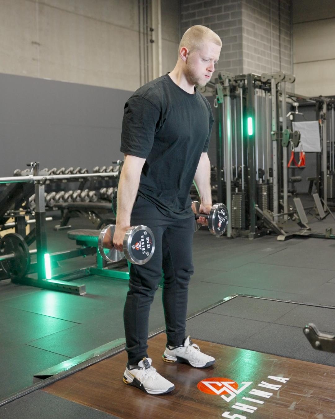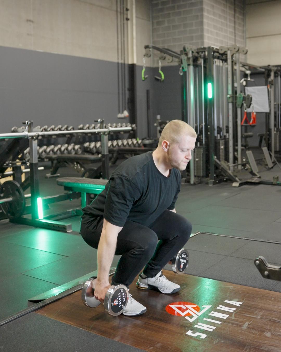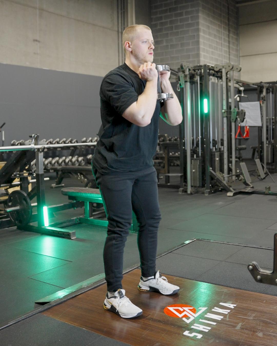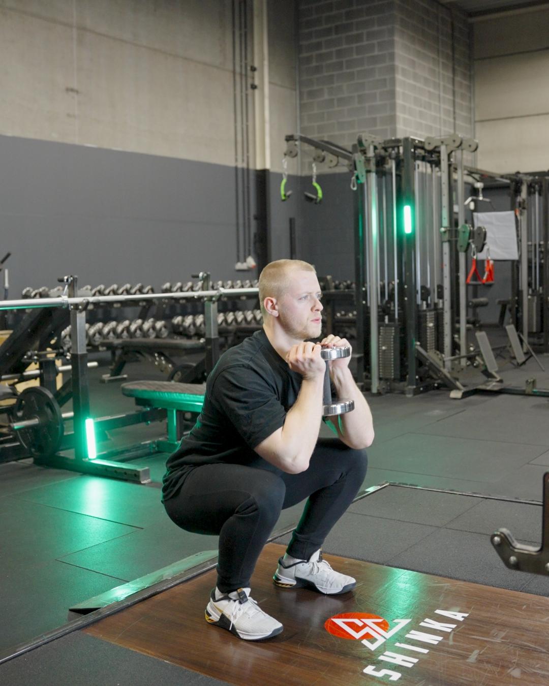 Hier maak je het complexer: armen langs het lichaam, een ander zwaartepunt, en meer vereisten qua coördinatie en core controle. Deze variant laat toe om zwaarder te trainen dan bij de goblet squat. Als je bij de goblet squat beperkt was tot 30 kg, kun je hier gemakkelijk twee dumbbells van 15 kg gebruiken en zo verder opbouwen.